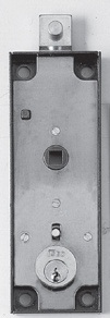 Serratura per serranda. Applicazione VERTICALE. Scatola verniciata. CATENACCIO zincato con PERNO Ø mm 9X8PER AGGANCIO ASTA. 1 mandata da mm 25 con maniglia, QUADRO MANIGLIA mm 8, sbloccaggio maniglia concilindro tondo Ø mm 25 dall’ esterno e con levetta dall’interno. Cilindro sporgente dalla scatola serratura.2 CHIAVI A PROFILO STANDARD